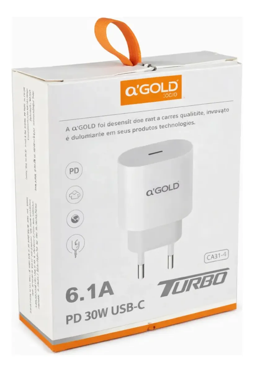 Carregador de parede Agold com potência de 30W, ideal para carregamento rápido e eficiente de dispositivos compatíveis com Tipo-C. Possui saída de até 6.1A, garantindo ótimo desempenho no dia a dia. Conta com tecnologia turbo e construção resistente para maior durabilidade.