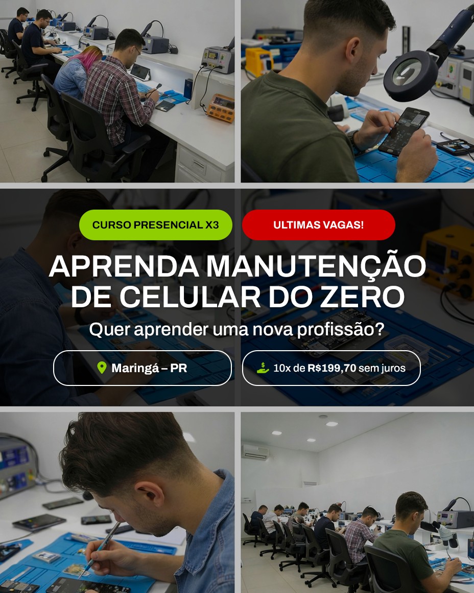 A X3 Distribuidora apresenta o curso Aprenda Manutenção de Celular do Zero – Curso Presencial X3, um treinamento desenvolvido para quem deseja iniciar na área de manutenção de celulares e aprender na prática os principais serviços realizados em assistências técnicas.